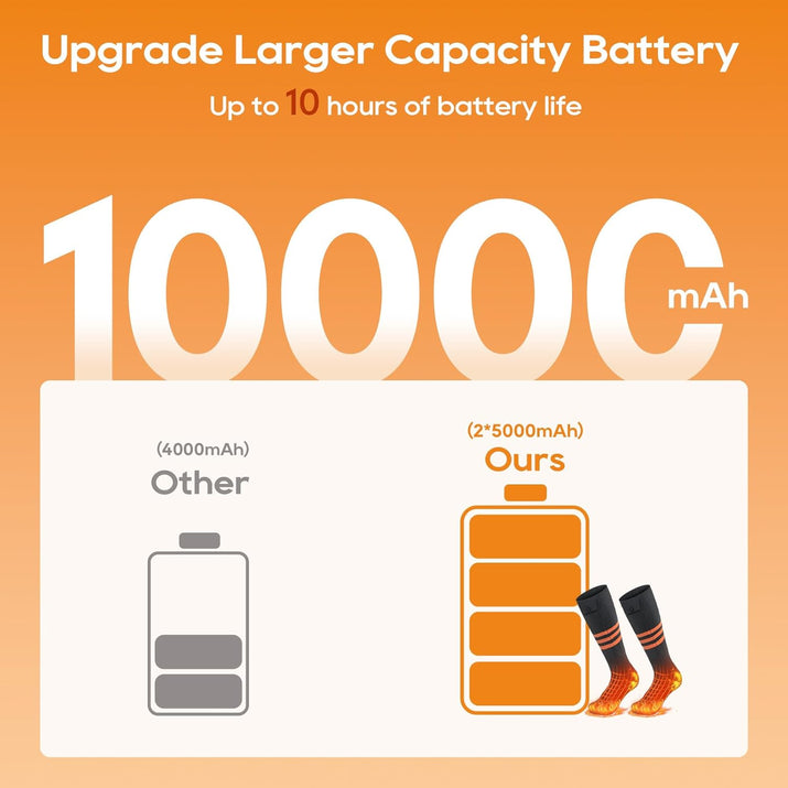 Our heated socks are powered by a high-capacity rechargeable battery that provides up to 10 hours of continuous warmth, allowing you to enjoy your outdoor adventures or cozy nights without worrying about cold feet.